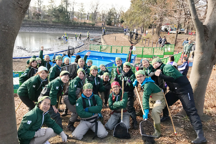 池の水を抜く「かいぼり」は、水辺の自然を守る優れた手法であるとともに、人々の興味を引きつける強い力をもっているため、身近な自然に目を向けてもらうきっかけとして力を入れて行なっています。
